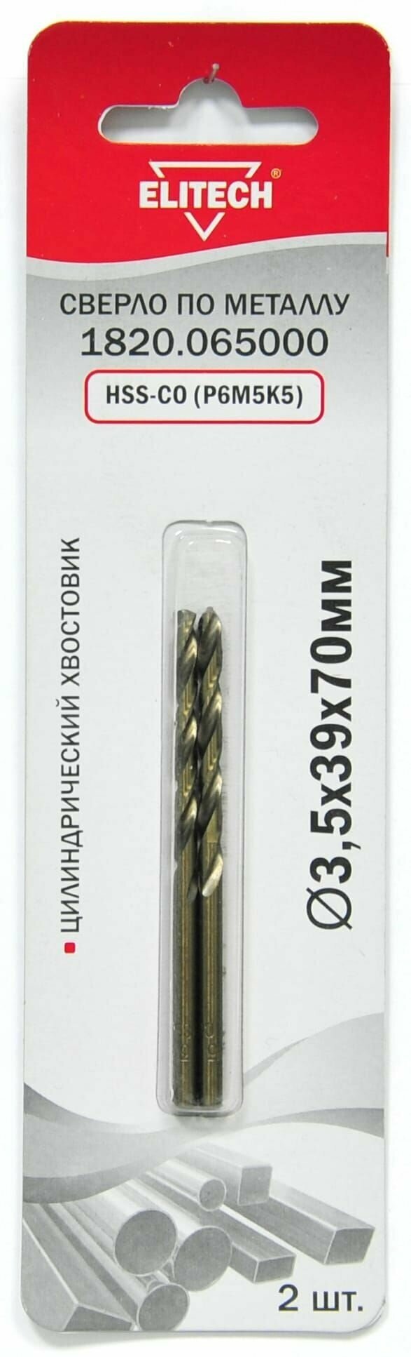 Dimensions: 3.5x39x70 mm, shank type: cylindrical, quantity in a set, package: 2 pcs., drill material: HSS Co, for metal