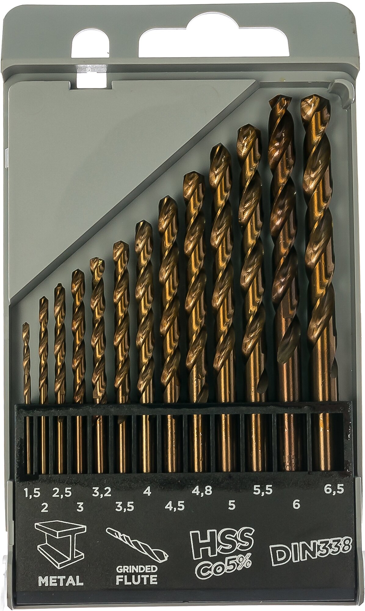 Sizes: for metal 1.5, 2, 2.5, 3, 3.2, 3.5, 4, 4.5, 4.8, 5, 5.5, 6, 6.5 mm, shank type: cylindrical, number in the set package: 13 pcs., drill material: HSS Co , for metal