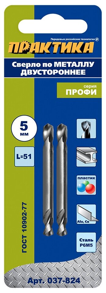 Drill for metal PRAKTIKA R6M5 5.0x51mm double-sided 2pcs