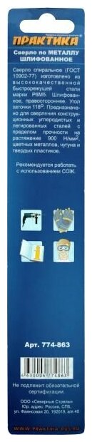 Equipment: piece, dimensions: 10x125x184 mm, shank type: cylindrical, quantity in a set package: 1 pc., drill material: HSS, sharpening angle: 118 degrees, for metal