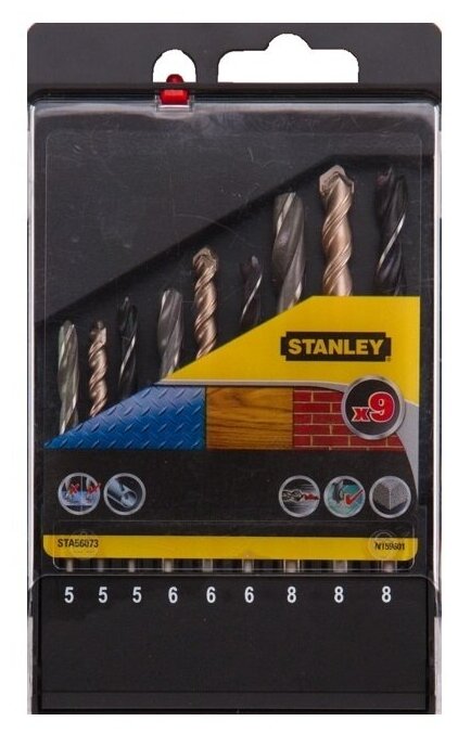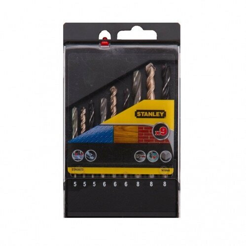Standard sizes: spiral for metal 5x52x86, 6x57x93, 8x75x117 mm; spiral for concrete 5x52x86, 6x57x93, 8x75x117 mm; spiral for wood 5x52x86, 6x57x93, 8x75x117 mm, shank type: cylindrical, quantity in a set package: 9 pcs., drill material: HS
