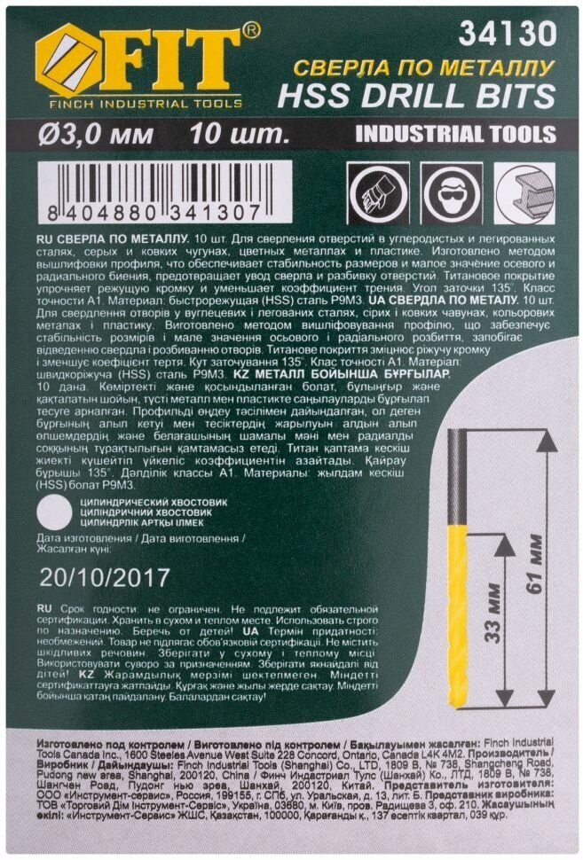 Dimensions: 3 mm, shank type: cylindrical, quantity per set per pack: 10 pcs., drill material: HSS-G TiN, for metal