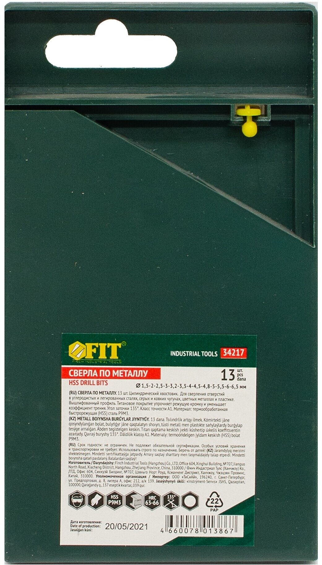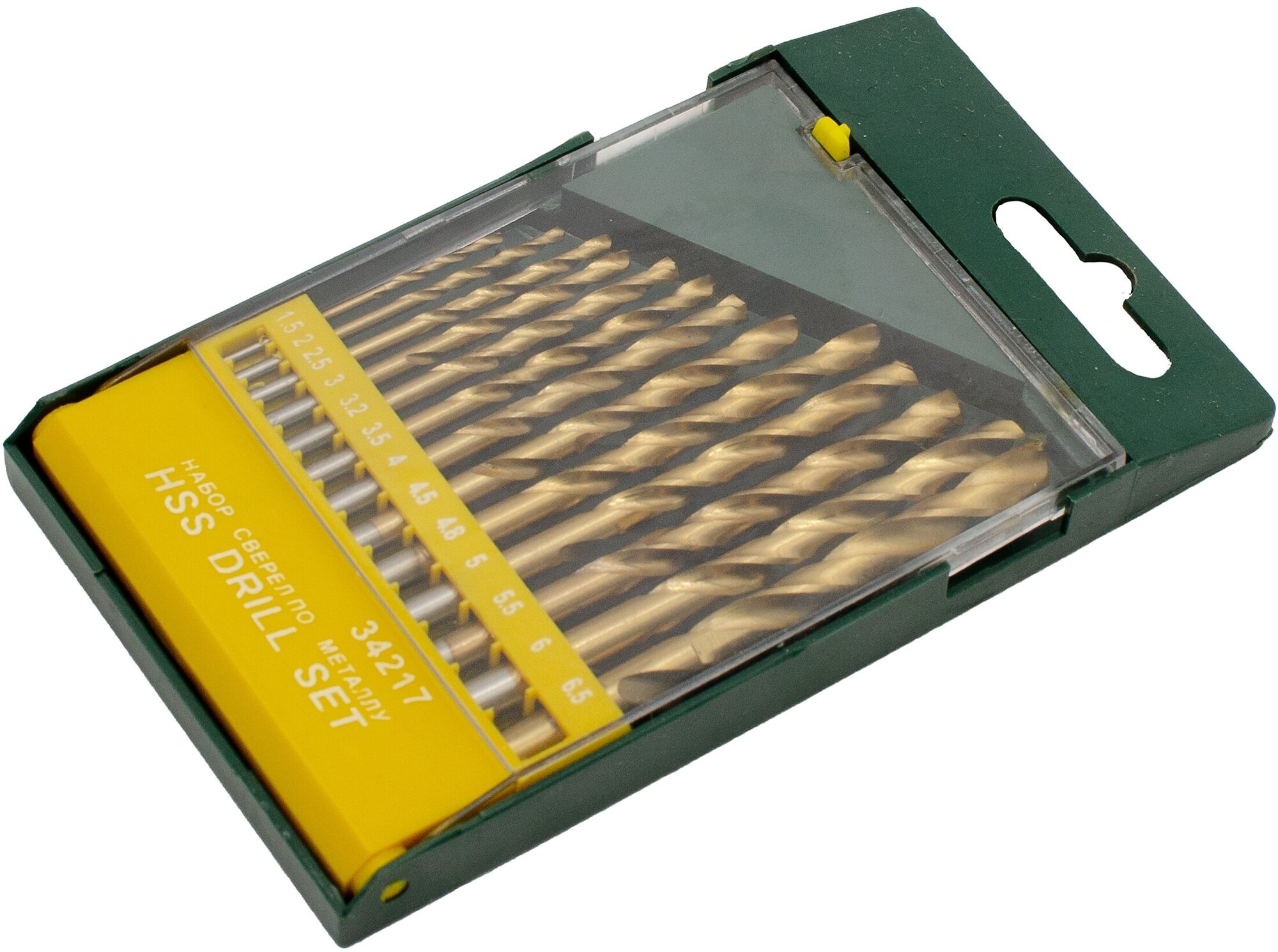 Standard sizes: for metal 1.5, 2, 2.5, 3, 3.2, 3.5, 4, 4.5, 4.8, 5, 5.5, 6, 6.5 mm, shank type: cylindrical, number in the set package: 13 pcs., drill material: HSS- G TiN, for metal