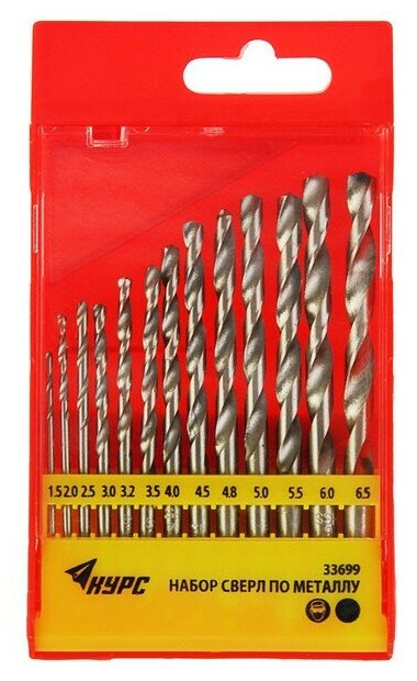 Description: Standard sizes: for metal 1.5, 2, 2.5, 3, 3.2, 3.5, 4, 4.5, 4.8, 5, 5.5, 6, 6.5 mm, shank type: cylindrical, number in the set package: 13 pcs., drill material: HSS, for metal
