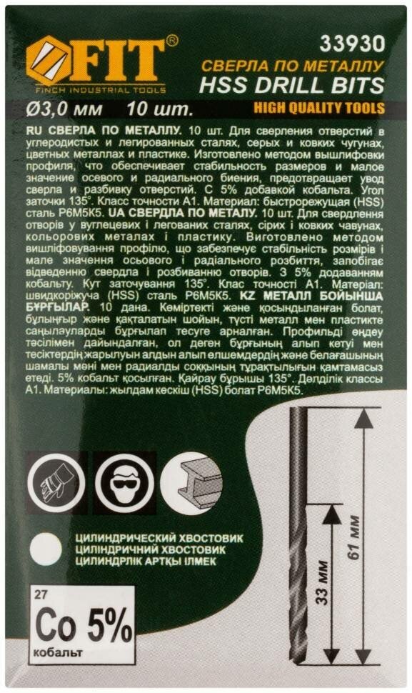 Dimensions: 3 mm, shank type: cylindrical, quantity per set per pack: 10 pcs., drill material: HSS Co 5, for metal