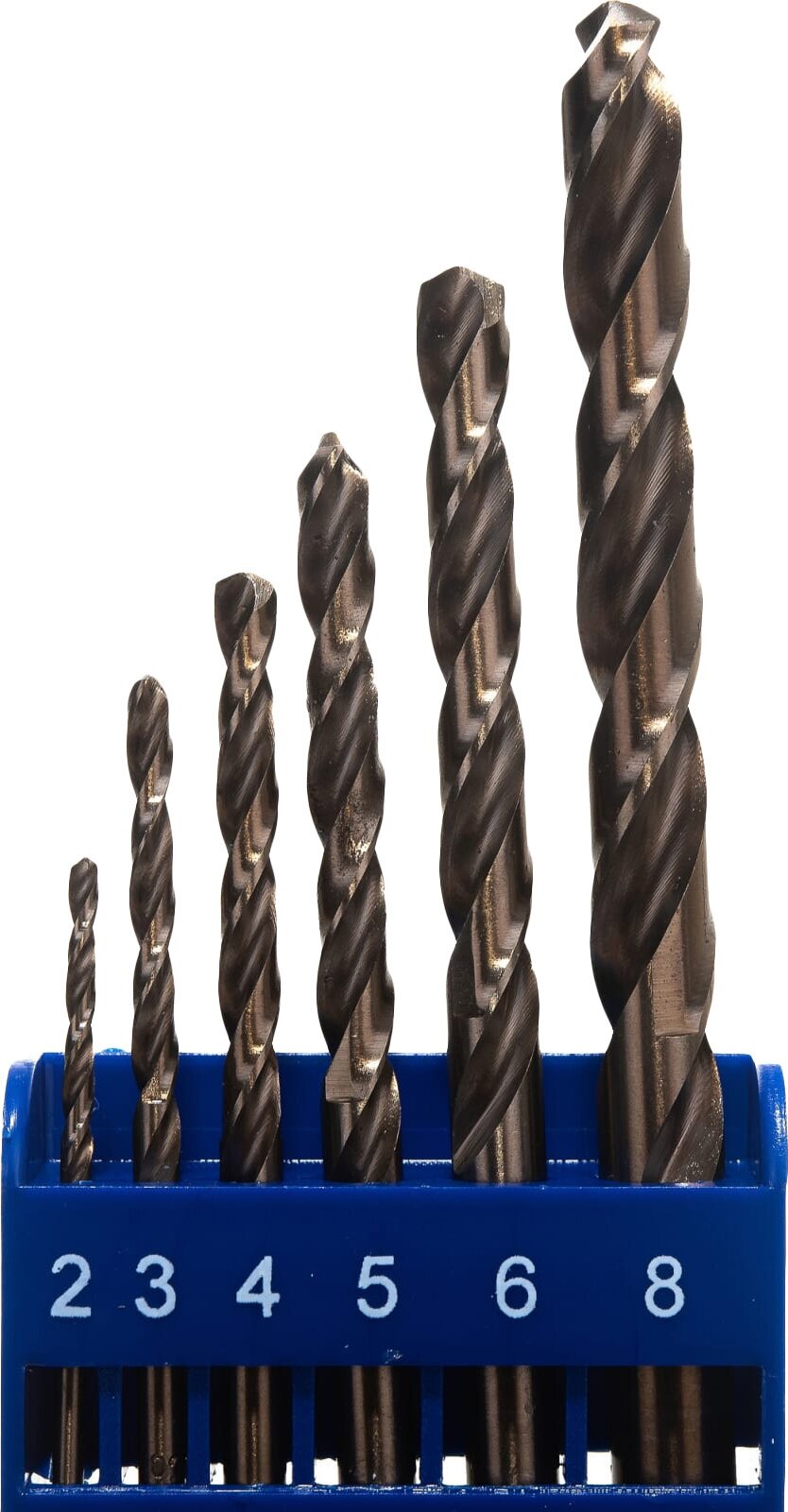 Standard sizes: for metal 2, 3, 4, 5, 6, 8 mm, shank type: cylindrical, quantity per set per package: 6 pcs., drill material: HSS Co 5, for metal