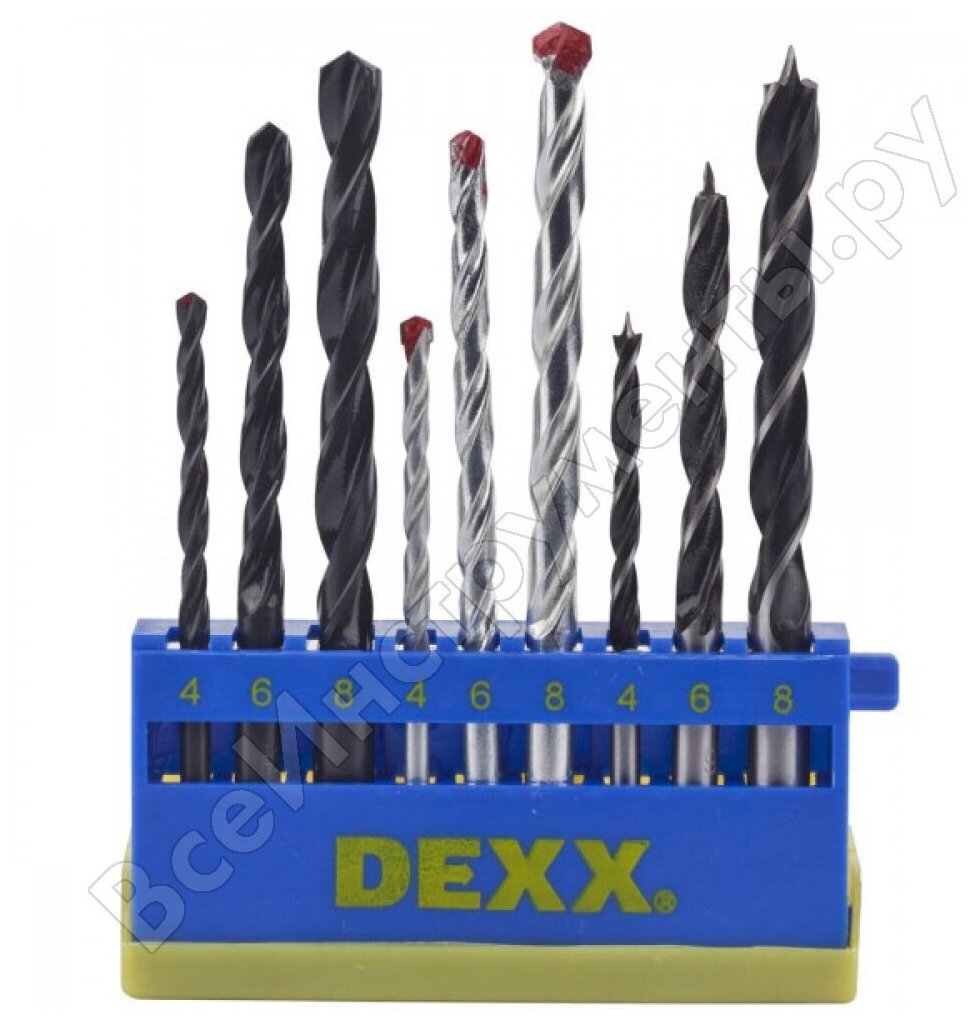 Complete set: set, standard sizes: for metal 2, 6, 8 mm; on brick 4, 6, 8 mm; for wood 4, 6, 8 mm, shank type: cylindrical, quantity per set per package: 9 pcs., drill material: HSS, for brick, for wood, for metal