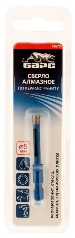 Equipment: Drill, drill, set of drills, dimensions: 5x35 mm, shank type: hexagonal, quantity in the set package: 1 pc., for ceramic tiles, for stone and porcelain stoneware