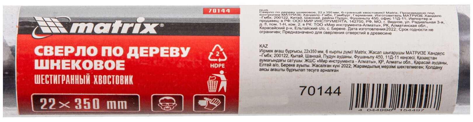 Auger drill for wood, 22 x 350 mm, 6-sided shank// Matrix