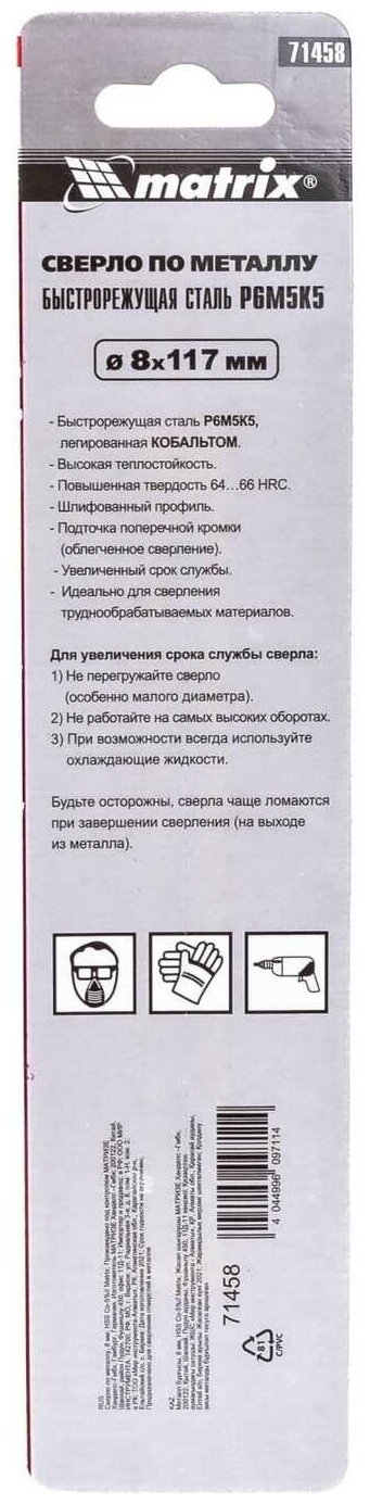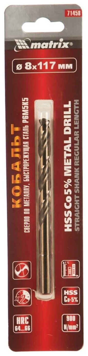 Equipment: piece, dimensions: 8x75x117 mm, shank type: cylindrical, quantity in a set package: 1 pc., drill material: HSS Co, sharpening angle: 135 degrees, for metal