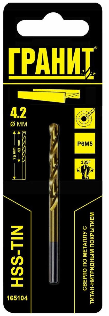 Equipment: piece, dimensions: 4.2x43x75 mm, shank type: cylindrical, quantity in the set package: 1 pc., drill material: HSS-G TiN, for metal
