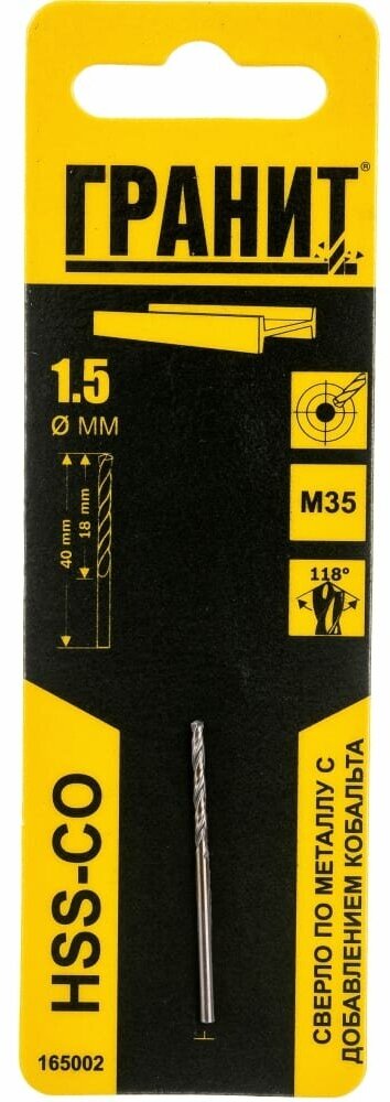 Equipment: piece, dimensions: 1.5x18x40 mm, shank type: cylindrical, quantity in the set package: 1 pc., drill material: HSS Co, for metal