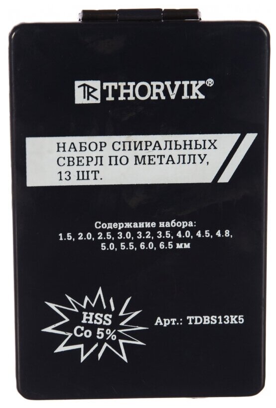 Sizes: diameters: 1.5, 2.0, 2.5, 3.0, 3.2, 3.5, 4.0, 4.5, 4.8, 5.0, 5.5, 6.0, 6.5 mm, shank type: cylindrical, quantity in a set package: 13 pieces, drill material: HSS Co , sharpening angle: 135 degrees, for metal