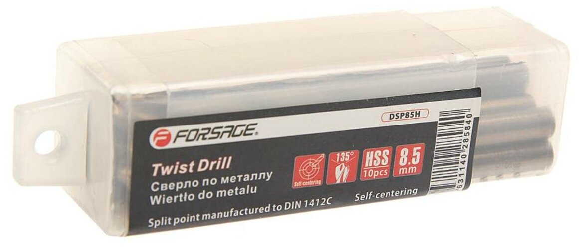 Dimensions: 8.5x72x117 mm, shank type: cylindrical, quantity in a set, package: 10 pcs., drill material: HSS, sharpening angle: 135 degrees, for metal