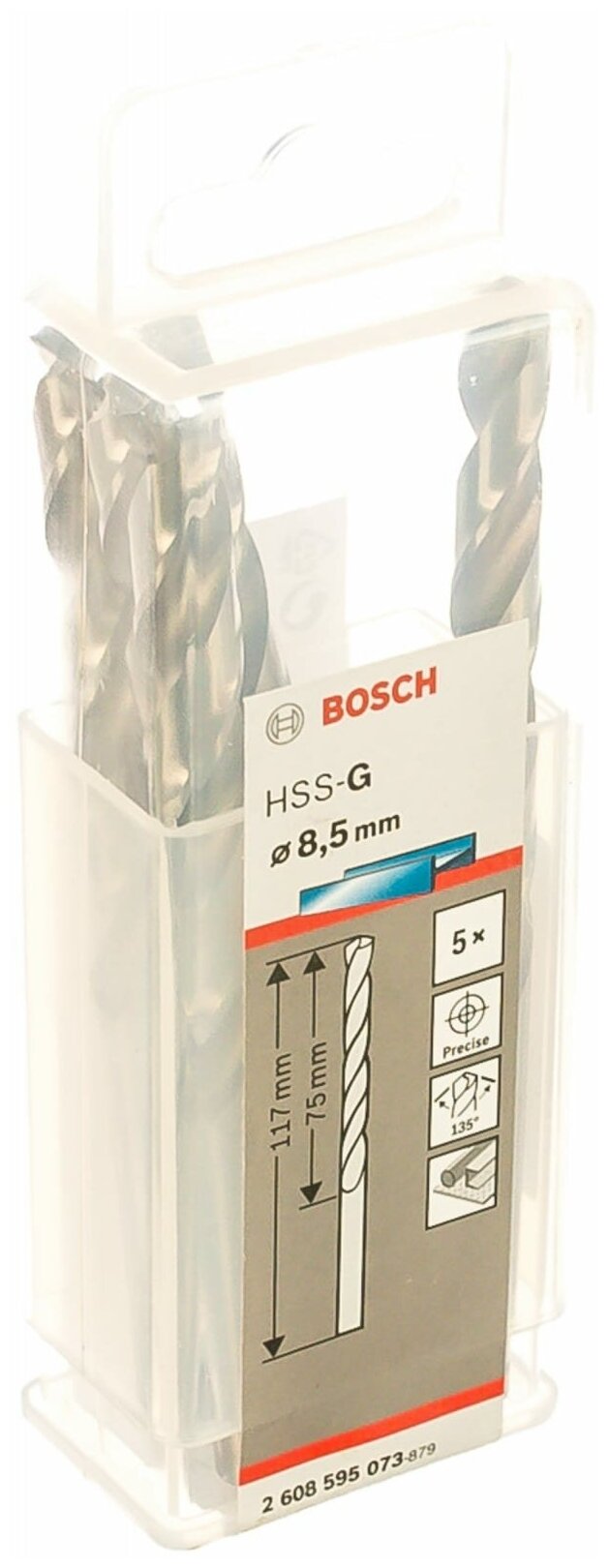 Dimensions: 8.5x75x117 mm, shank type: cylindrical, quantity in a set package: 5 pcs., drill material: HSS-G, sharpening angle: 135 degrees, for metal