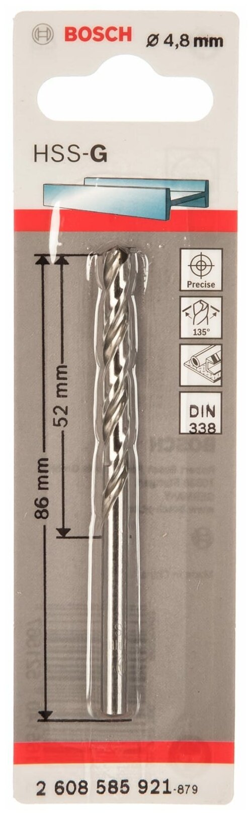 Equipment: piece, dimensions: 4.8x52x86 mm, shank type: cylindrical, quantity in the set package: 1 pc., drill material: HSS-G, sharpening angle: 135 degrees, for metal