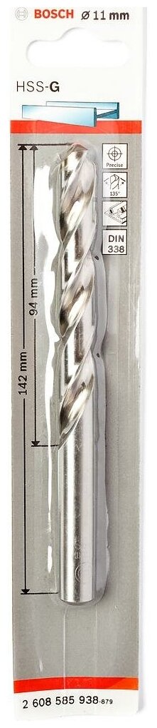Equipment: piece, dimensions: 11x94x142 mm, shank type: cylindrical, quantity in the set package: 1 pc., drill material: HSS-G, sharpening angle: 135 degrees, for metal