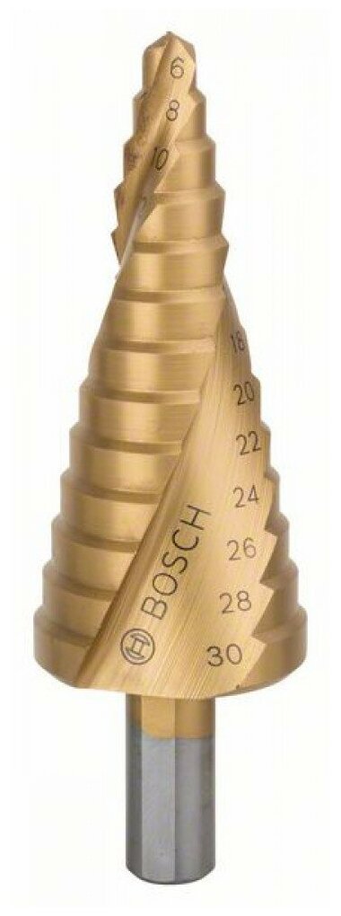 Equipment: piece, standard sizes: 13 steps 6, 8, 10, 12, 14, 16, 18, 20, 22, 24, 26, 28, 30 mm, shank type: trihedral, quantity in the set package: 1 piece, material drills: HSS-G TiN, for metal
