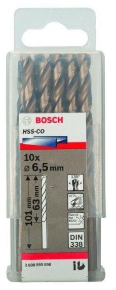 Equipment: set, dimensions: 6.5x63x101 mm, shank type: cylindrical, quantity in the set package: 10 pcs., drill material: HSS Co, sharpening angle: 135 degrees, for metal