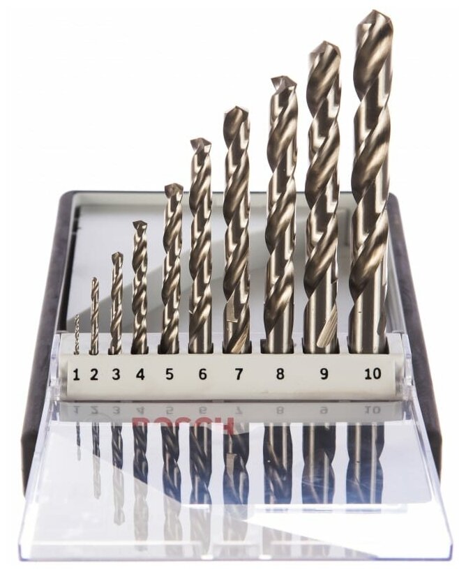 Equipment: set, sizes: for metal 1x12, 2x24, 3x33, 4x43, 5x52, 6x57, 7x69, 8x75, 9x81, 10x87 mm, shank type: cylindrical, quantity in the set package: 10 pcs., drill material: HSS-G, sharpening angle: 135 degrees, for metal