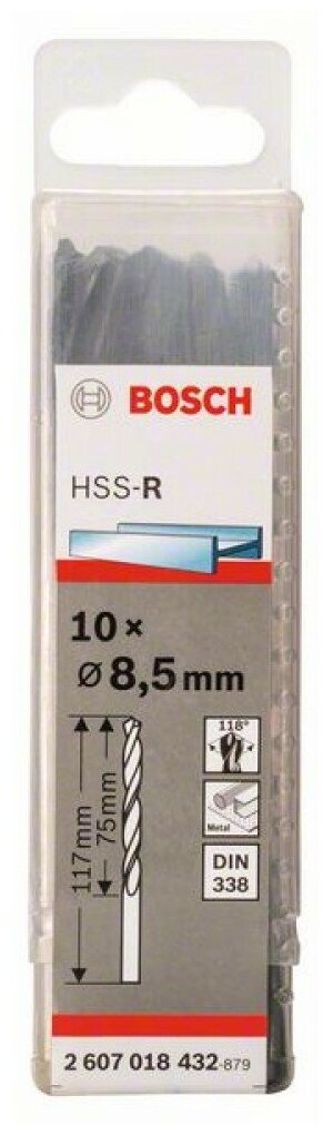 Dimensions: 8.5x75x117 mm, shank type: cylindrical, quantity per set per package: 10 pcs., drill material: HSS-R, sharpening angle: 118 degrees, for metal