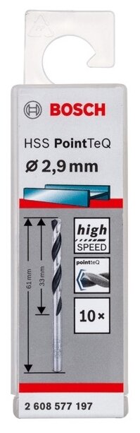 Dimensions: 2.9x33x61 mm, shank type: cylindrical, quantity per set per package: 10 pcs., drill material: HSS, sharpening angle: 135 degrees, for metal
