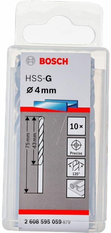 Complete set: piece set, dimensions: 4x43x75 mm, shank type: cylindrical, quantity in a set package: 10 pcs., drill material: HSS-G, sharpening angle: 135 degrees, for metal