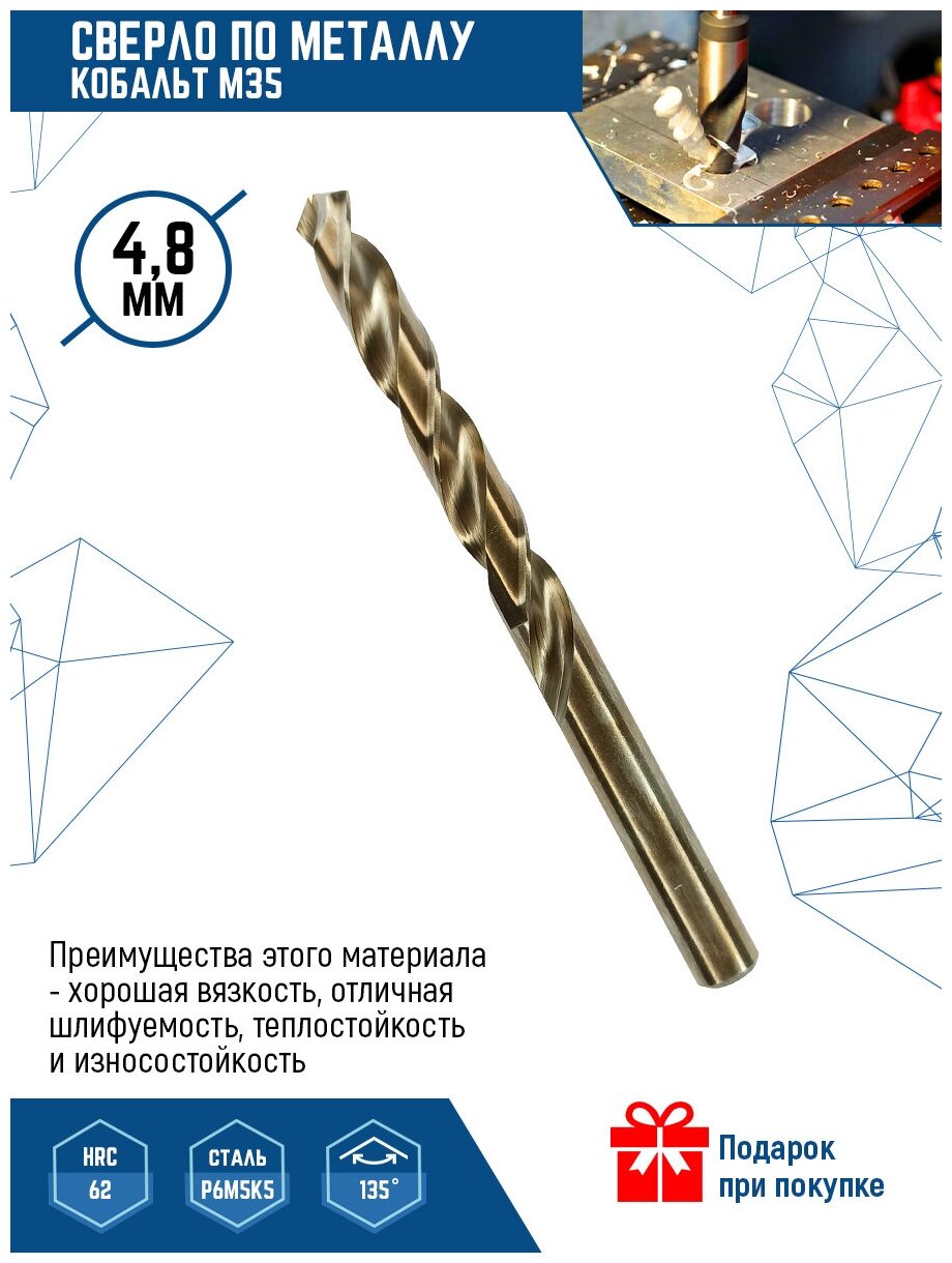 Equipment: piece, shank type: cylindrical, quantity in a set package: 1 pc., drill material: HSS Co 5, sharpening angle: 135 degrees, for metal