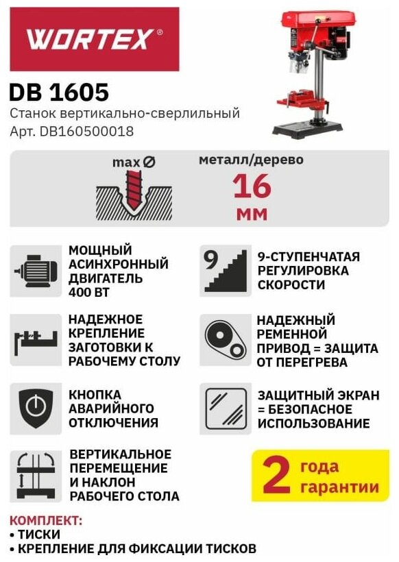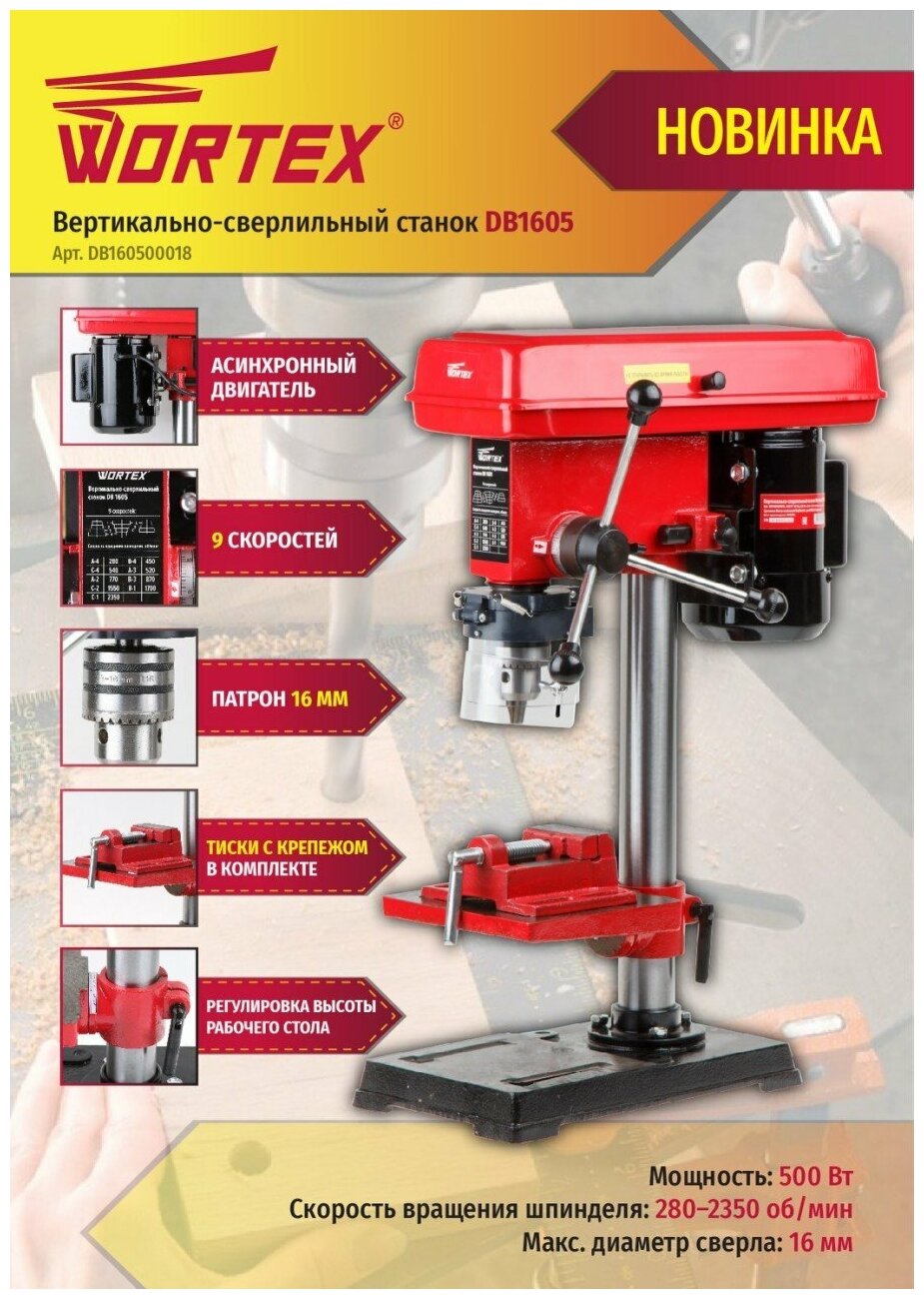 Vertical WORTEX DB 1605 500 W, drilling in metal up to 16 mm, 9 speeds, chuck 16 mm DB160500018