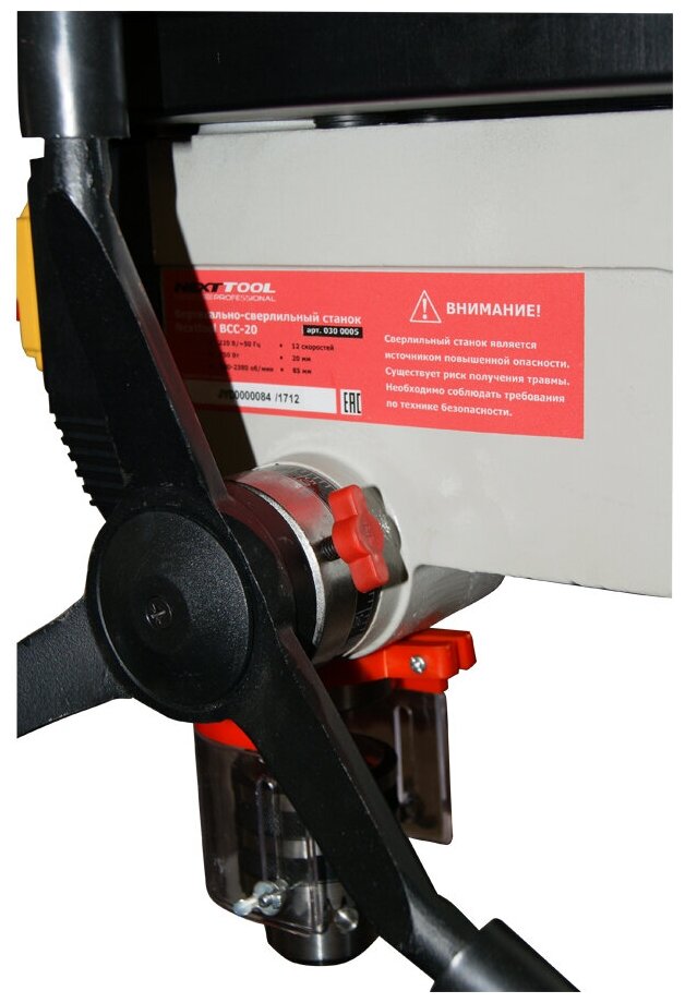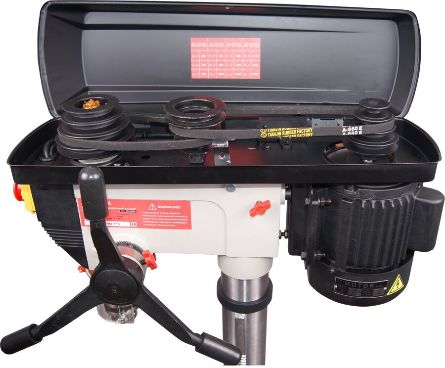 Type of machine: vertical drilling, maximum voltage: 220 V, number of revolutions: 2380 rpm, number of speeds: 12, installation: desktop, options: protective glass, table tilt