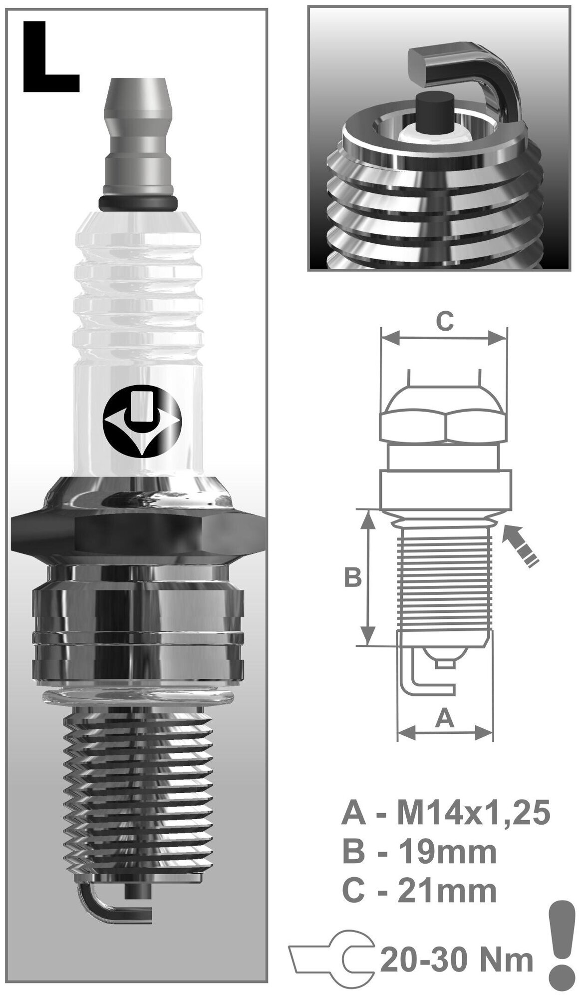 Thread size: M14, standard thread length: 19 mm, head size: 22 mm, number of ground electrodes: 1, features: resistor