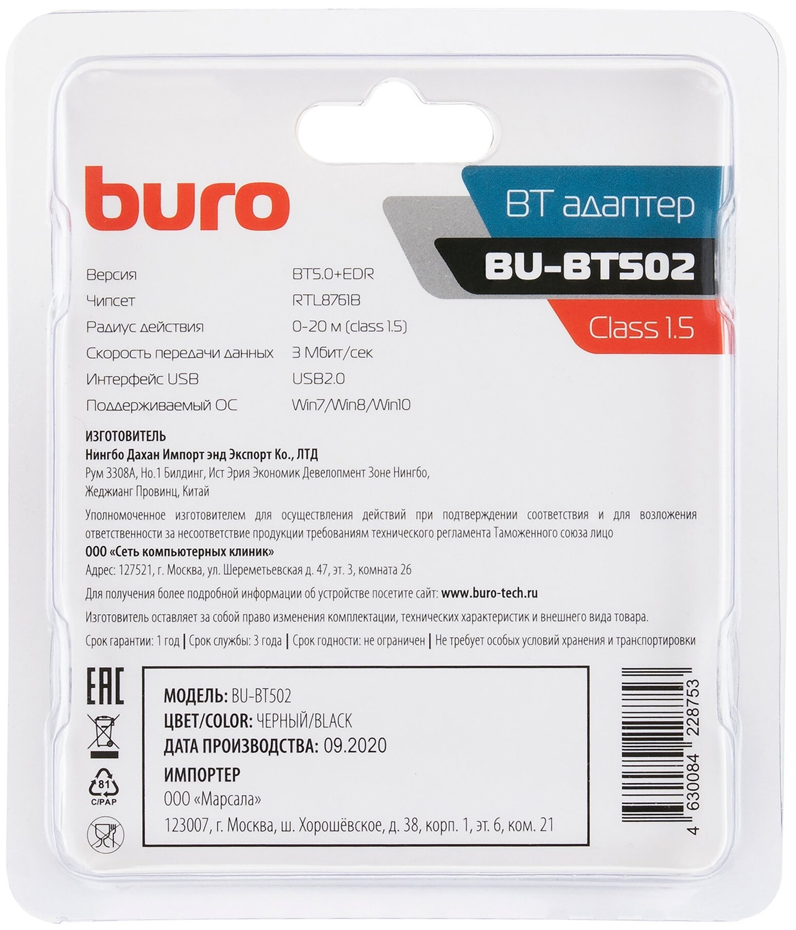 USB adapter Digma D-BT502 Bluetooth 5.0+EDR class 1.5 20m black