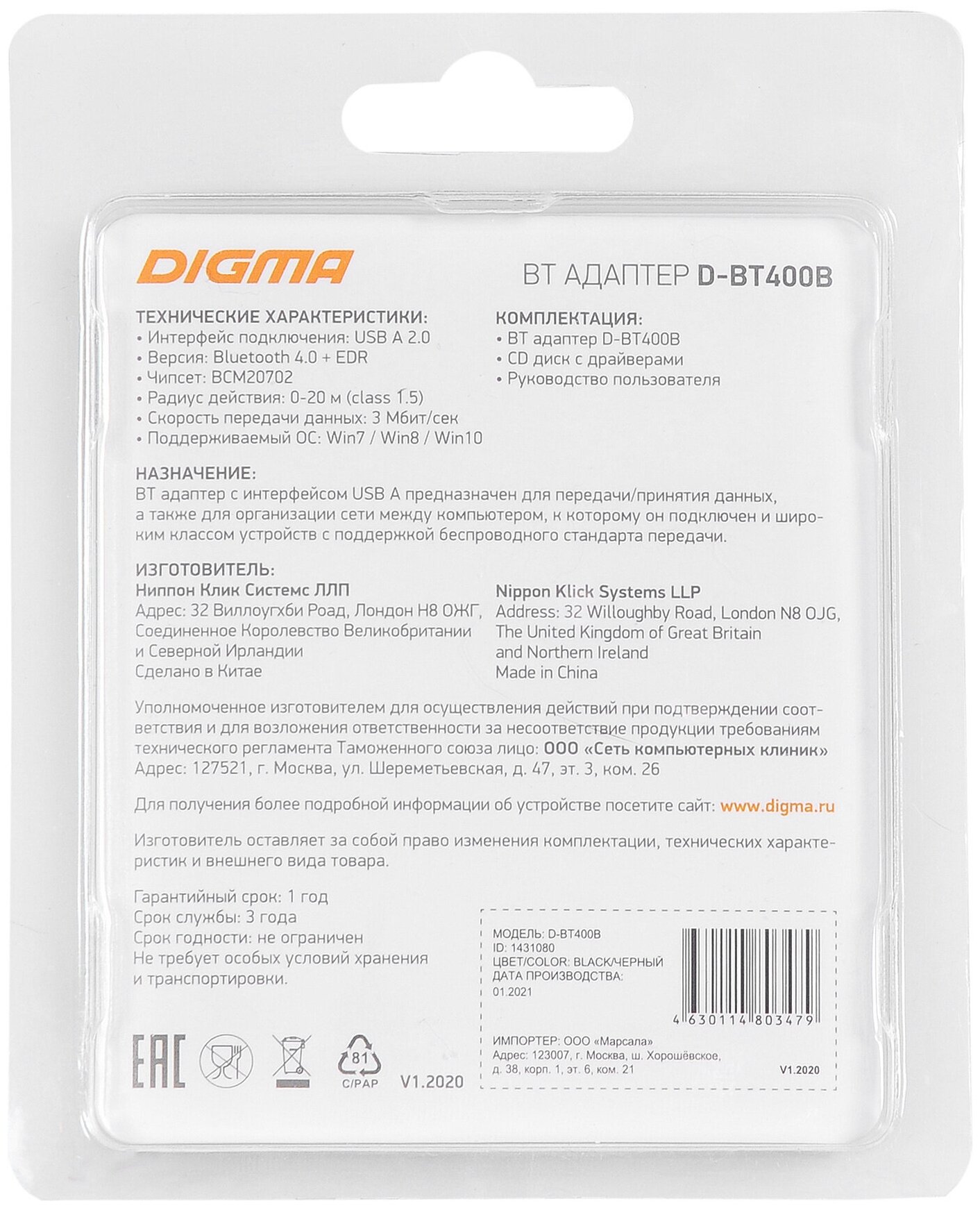 Bluetooth adapter DIGMA D-BT400B