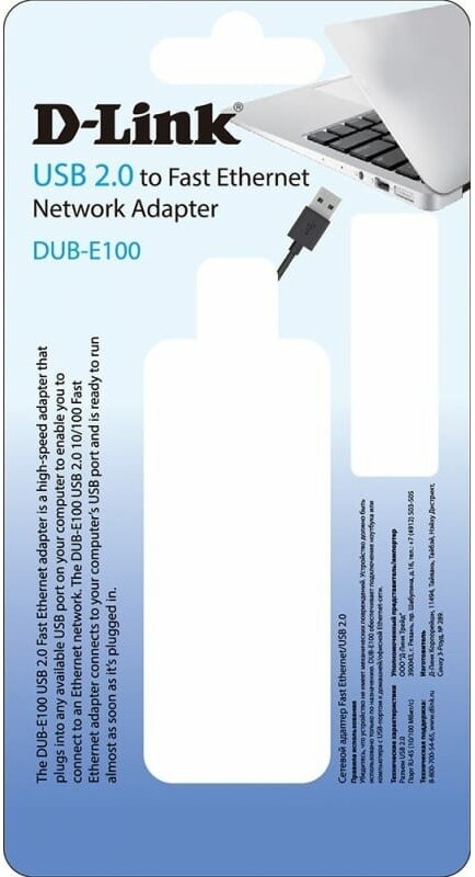 Adapter type: network adapter, connection interface: USB, transfer rate: 100 Mbps, total number of ports: 1, USB standard: USB 2.0, functions and features: Wake-on-LAN