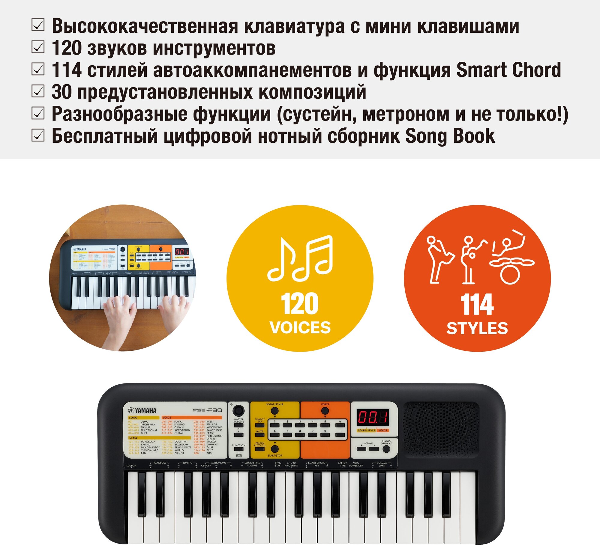 Number of keys: 37, key size: small, keyboard hardness: unweighted, pedals: no, body: compact, multi-timbral: 1, auto-off, metronome, transposition, headphone output, 3.5 m