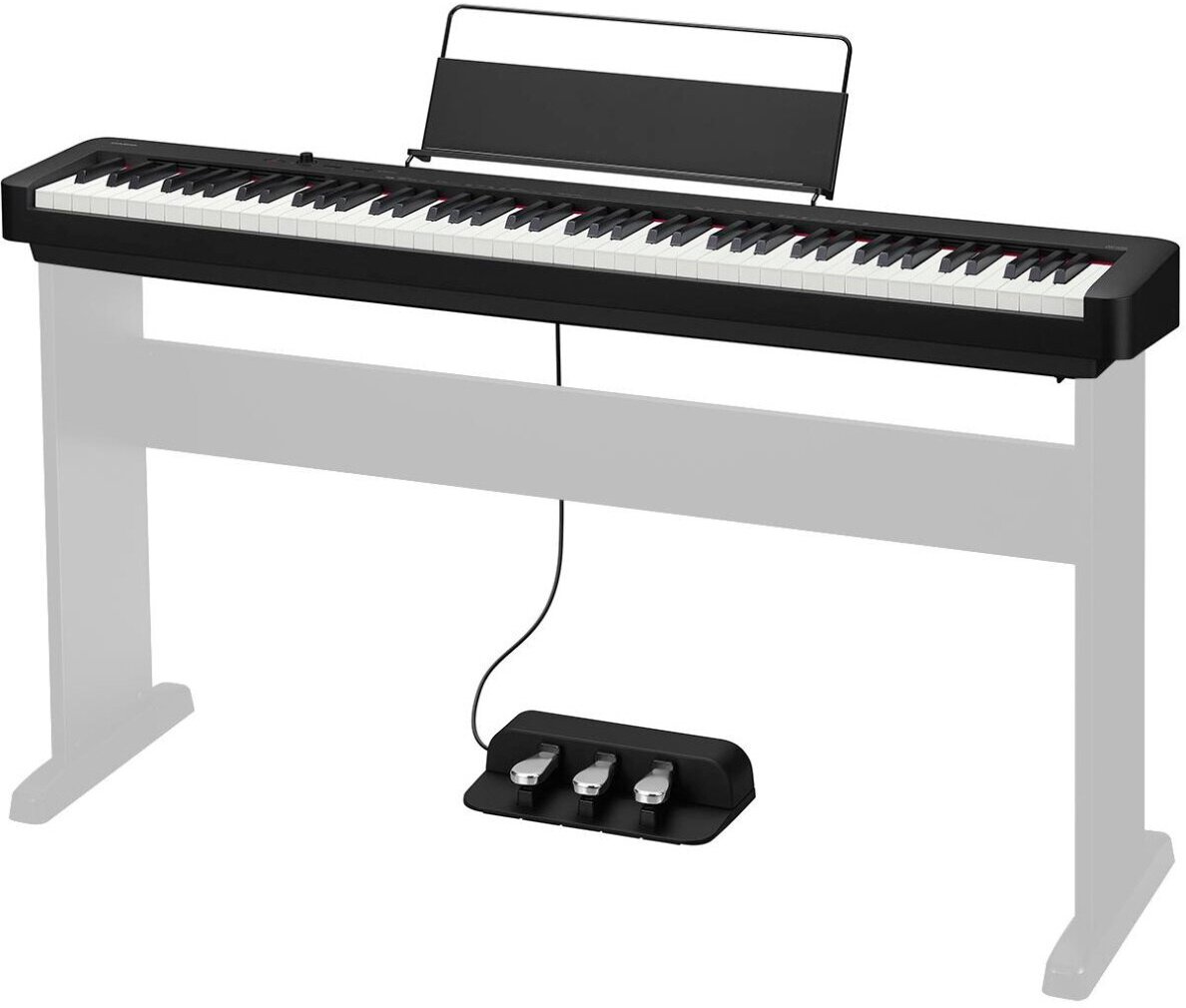 Number of keys: 88, key size: full-size, keyboard hardness: weighted, hammer action, pedals: plug-in, right damper pedal, body: compact, metronome, reverb, transposition, feel