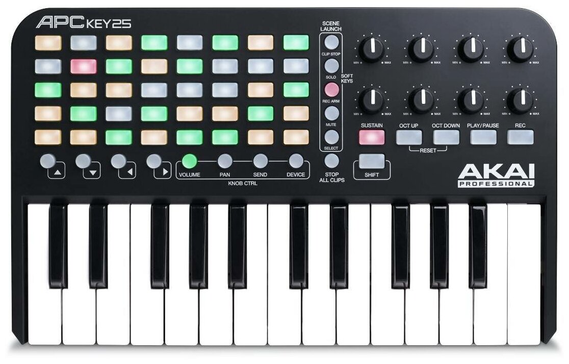 Number of keys: 25, key size: full-size, keyboard hardness: unweighted, pedals: no, body: compact, USB Type B, power supply: USB powered, battery/accumulator operation, USB powered