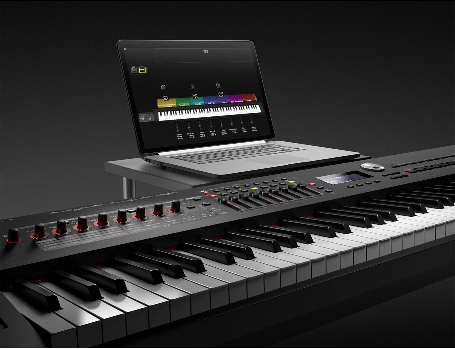Number of keys: 88, key size: full-size, keyboard hardness: weighted, hammer action, display, pedals: pluggable, pitch bend controller, modulation controller, right damper pedal, to