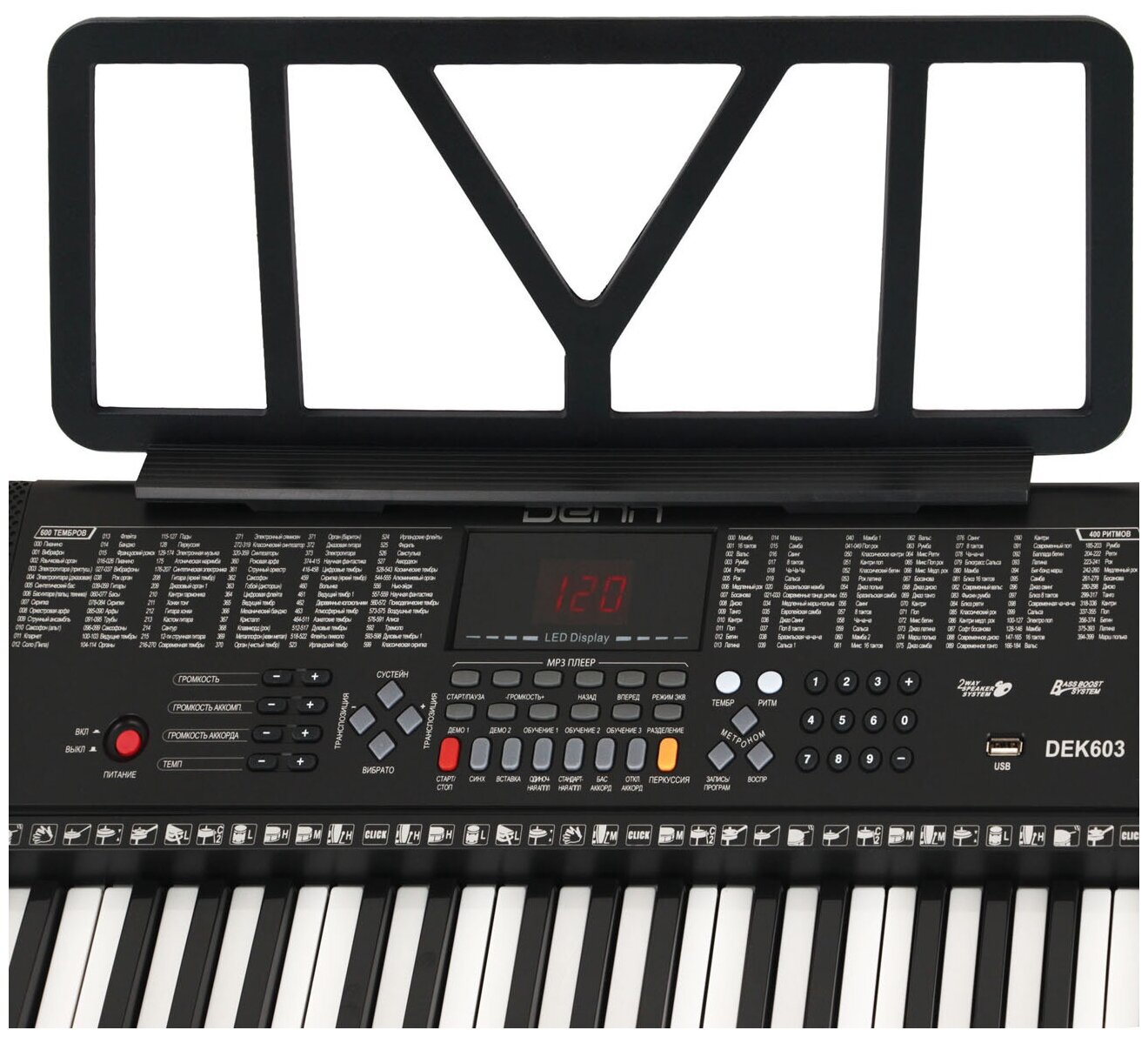 Number of keys: 61, key size: full-size, keyboard hardness: unweighted, display, pedals: no, body: compact, metronome, practice, reverb, headphone out, mic in, built-in