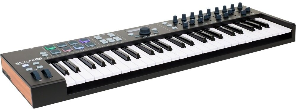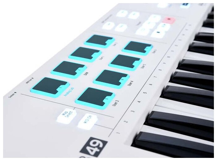 Included software Analog Lab 2, Ableton Live Lite, UVI Grand Piano model D; 9 encoders, 9 sliders, 6 transport switches, 8 velocity sensitive illuminated pads