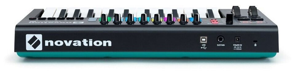 Number of keys: 25, key size: full-size, keyboard hardness: unweighted, display, pedals: plug-in, pitch bend controller, modulation controller, body: compact, keyboard sensitivity