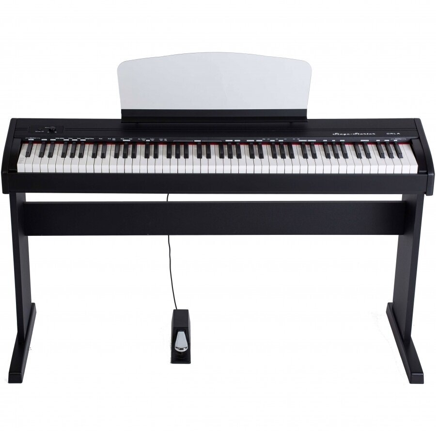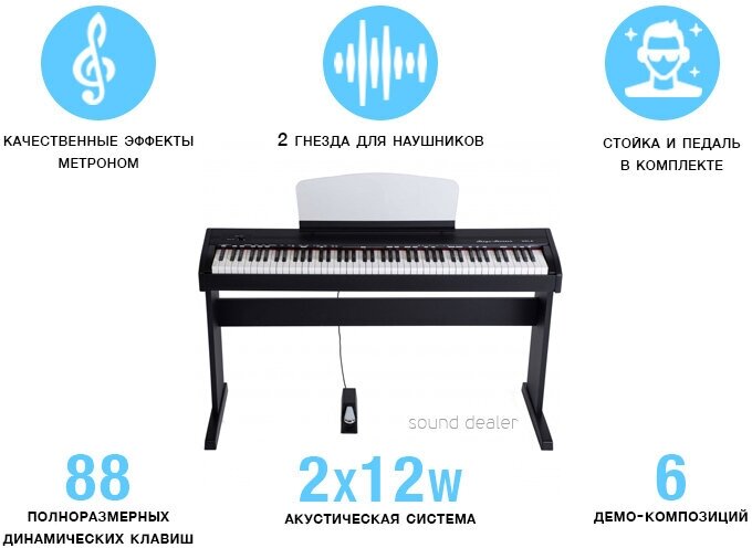 Number of keys: 88, key size: full-size, keyboard hardness: weighted, hammer action, pedals: plug-in, left una corda pedal, right damper pedal, middle sostenuto pedal, body: compact, meter