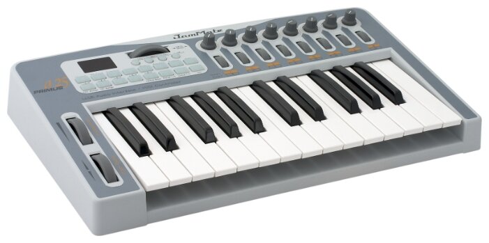 Number of keys: 25, key size: full size, display, pedals: pluggable, pitch bend controller, modulation controller, body: compact, keyboard touch sensitivity, USB Type B, MIDI in, output