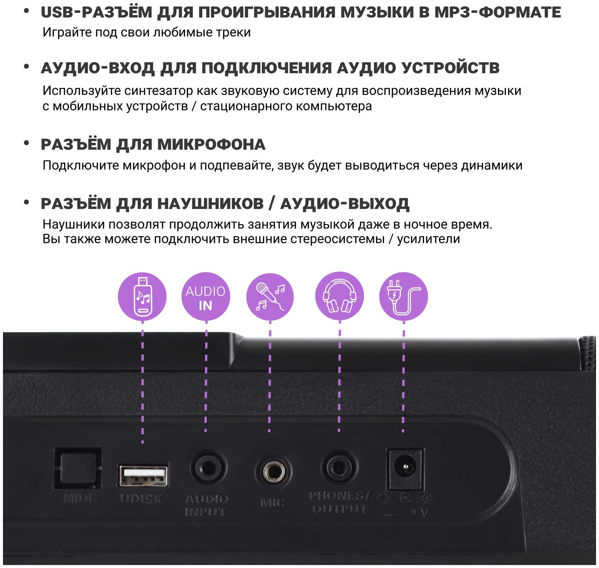 Number of keys: 54, key size: full size, keyboard hardness: unweighted, display, pedals: no, body: compact, auto accompaniment, song recording, metronome, learning, split keyboard, tra