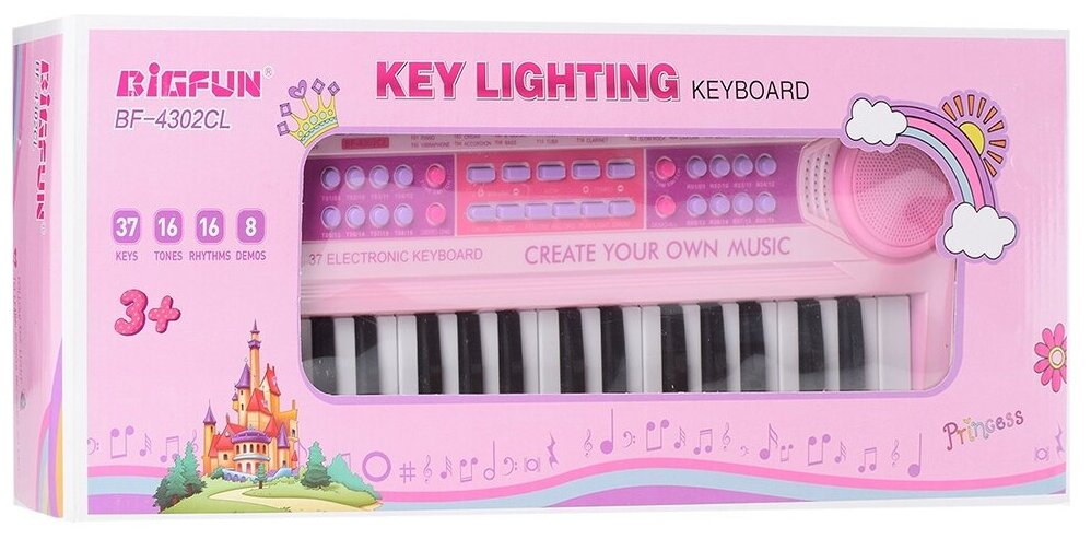 Number of keys: 37, key size: small, key lighting, pedals: no, body: compact, auto accompaniment, song recording, microphone input, built-in speaker system, number of timbres: 16, with
