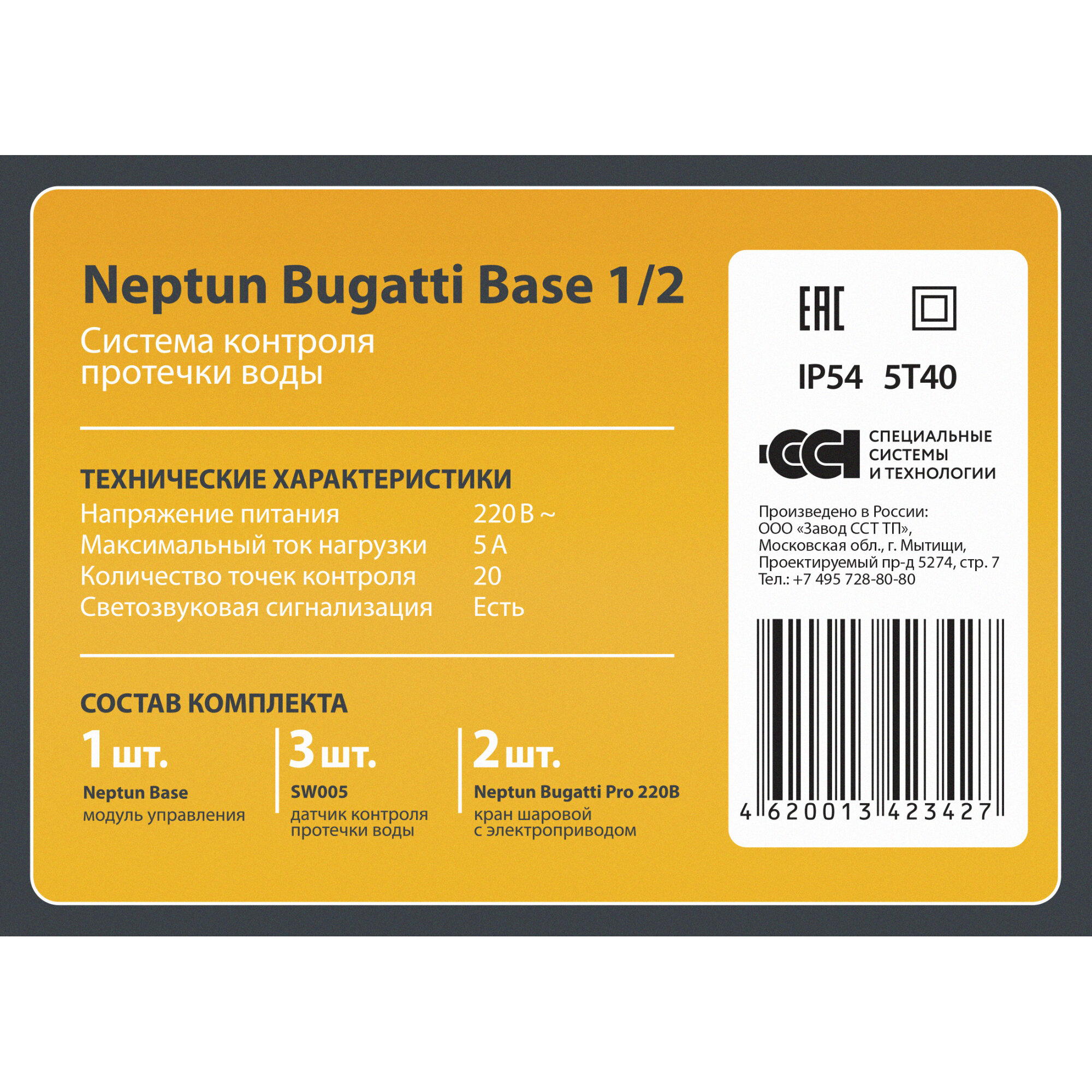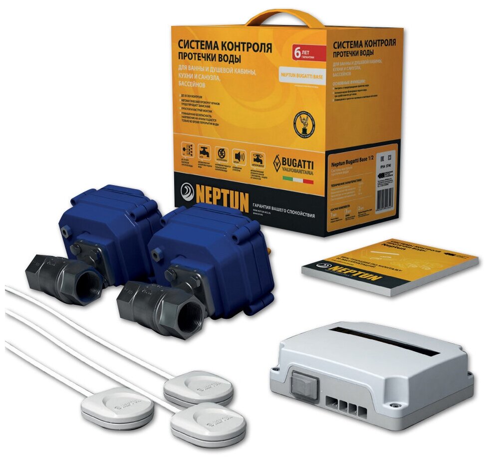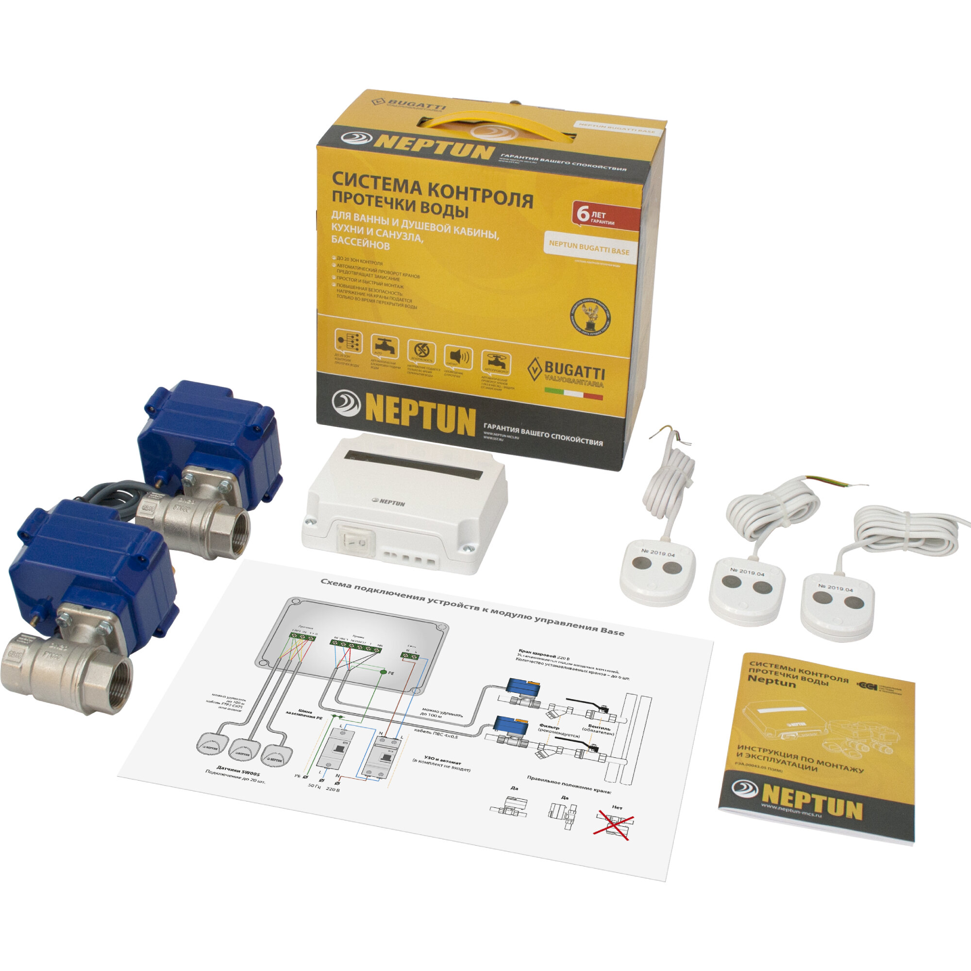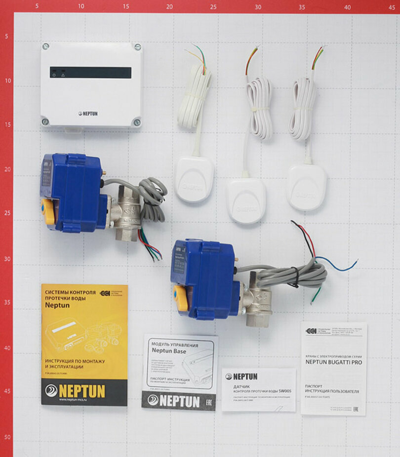 Neptun Base control module - 1 pc., wired water leakage sensor SW005 - 3 pcs., 1/2 ball valve with electric drive Neptun Bugatti Pro 220V series - 2 pcs., instructions