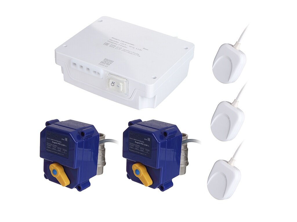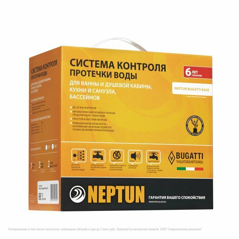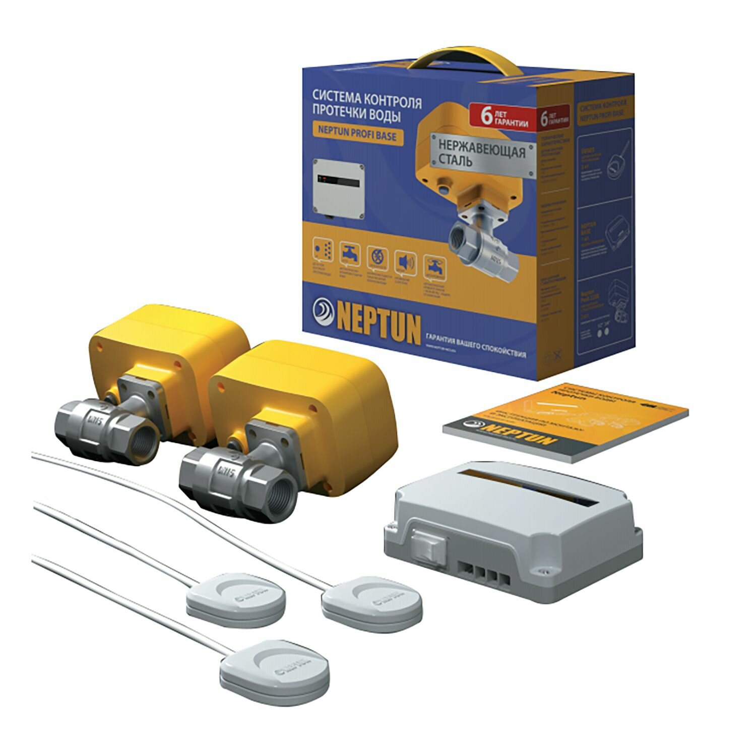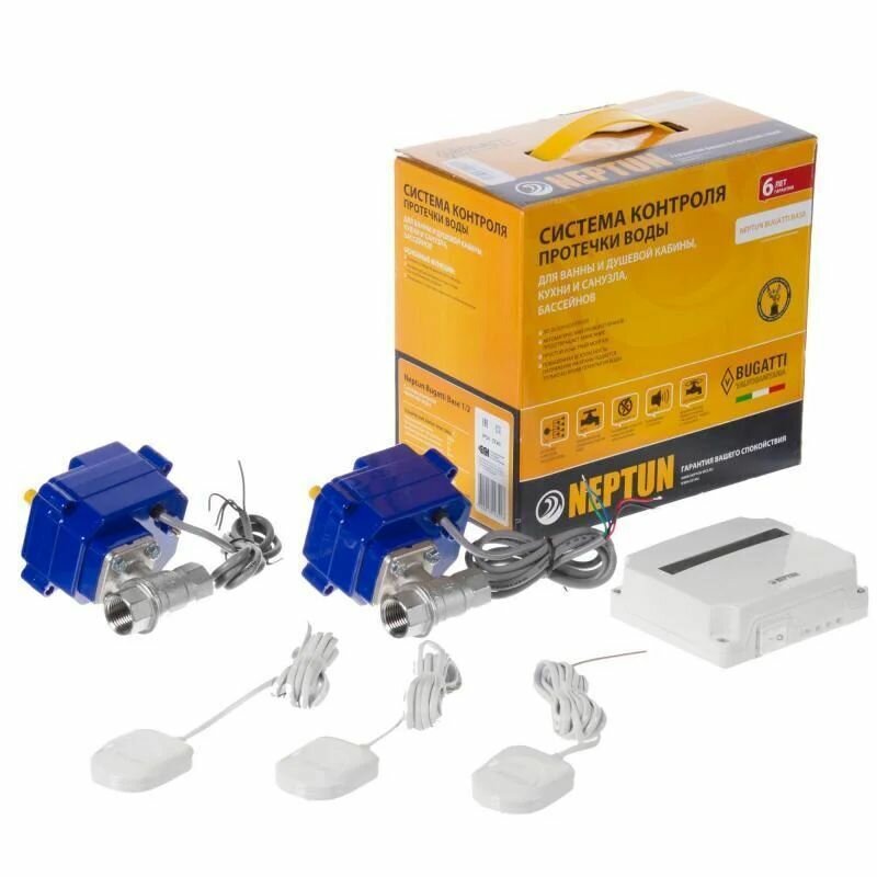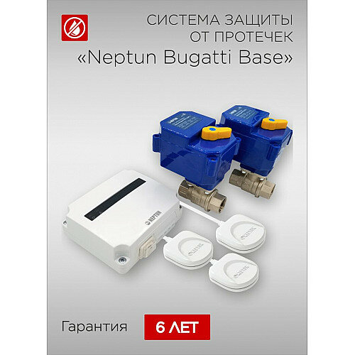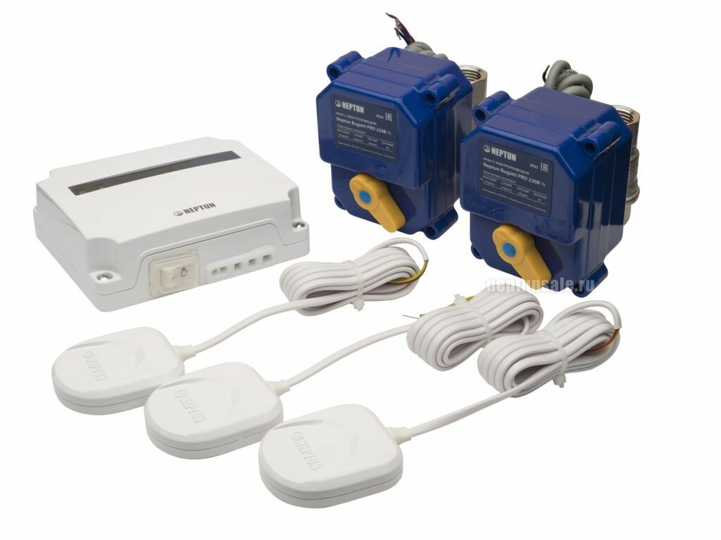 Neptun Base control module - 1 pc., wired water leakage sensor SW005 - 3 pcs., 1/2 ball valve with electric drive Neptun Bugatti Pro 220V series - 2 pcs., instructions