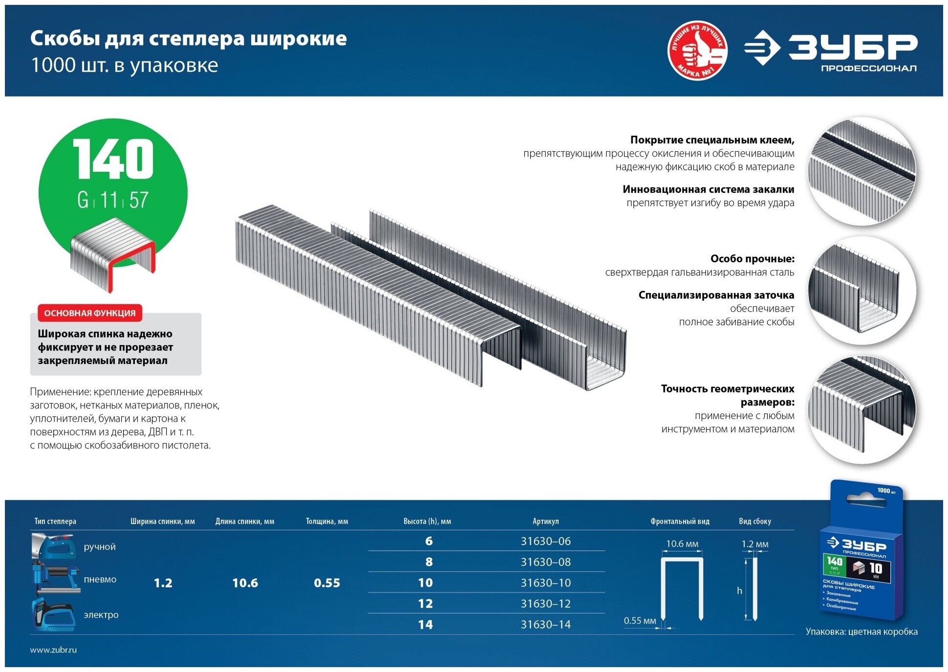 Product type: staples, Staples for construction stapler, staple type: type 140, length: 6 mm, staple width: 10.60 mm, staple thickness: 1.20 mm, pack quantity: 1000 pcs., weight: 0.11 kg