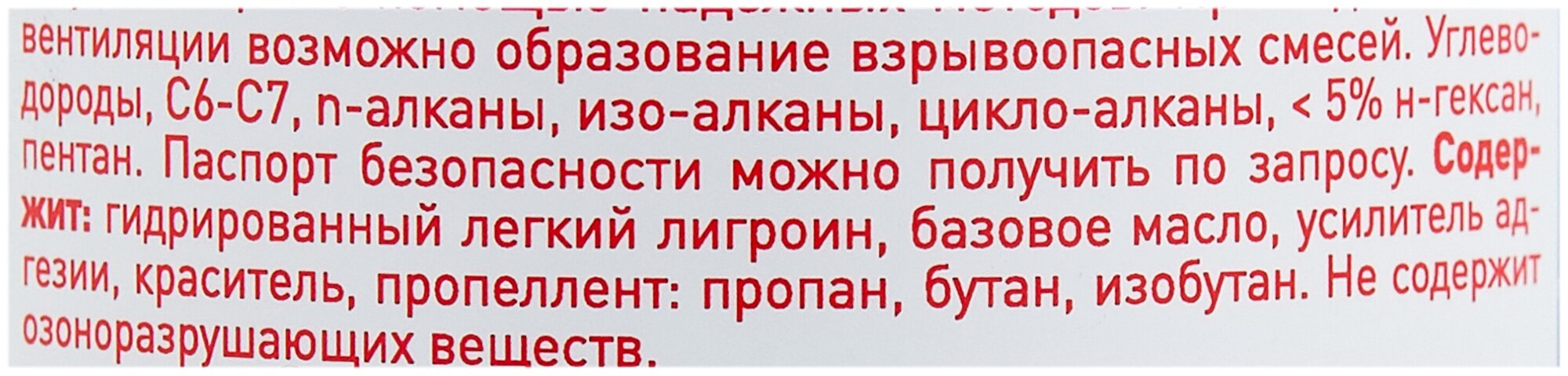 Contains: hydrogenated light naphtha, base oil, adhesion promoter, dye, propellant: propane, butane, isobutane