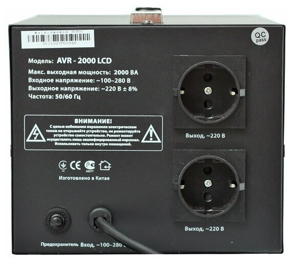 Input voltage type: single-phase, stabilizer type: relay, location: floor, min. input operating voltage: 180 V, max. input operating voltage: 264 V, output sockets with stabilization: 3 pcs., error